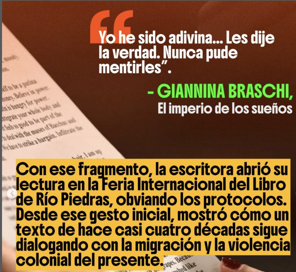 Braschi desafía los rituales y abre su lectura magistral en la primera Feria Internacional del Libro de Río Piedras —celebrada del 3 al 8 de noviembre en la Universidad de Puerto Rico de Río Piedras— con un fragmento de su libro El imperio de los sueños (1988), obra fundacional con la que desafió toda clasificación. La escritora puertorriqueña no escoge este fragmento al azar. Lo hace con toda la intención. Ese texto, escrito hace casi cuatro décadas atrás, es una epopeya posmoderna y poscolonial sobre la vida de los migrantes en Estados Unidos.