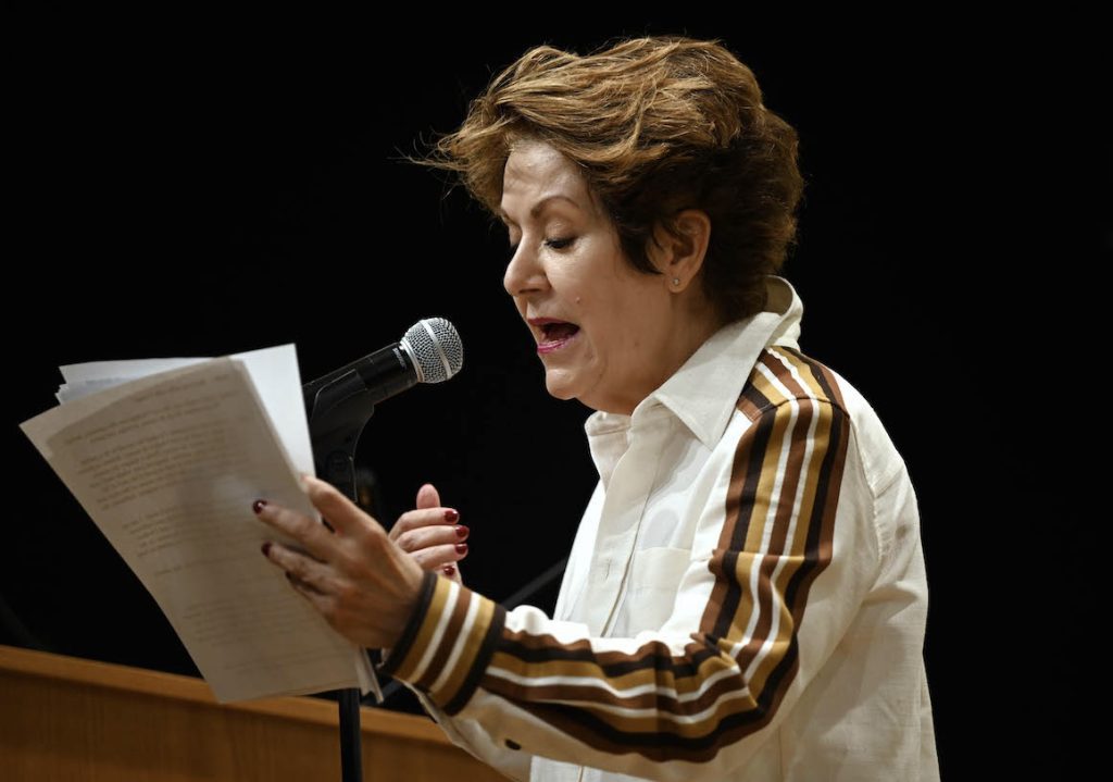 Giannina Braschi se prepara para leer. Se levanta con calma de una de las sillas del salón L-1 de la Escuela de Derecho de la Universidad de Puerto Rico y camina hacia la tarima entre aplausos y una estela de silencio. No se coloca en el podio. Se planta frente a un esbelto micrófono solitario y comienza. No hay protocolo ni discursos formales. La poeta, narradora, filósofa del caos y de la libertad creadora, va directo a la poesía, a la insurrección de la palabra.